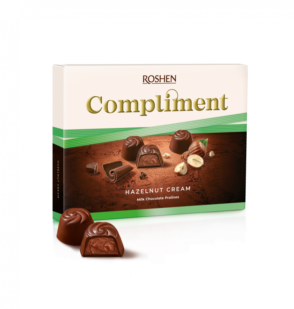 Boxed chocolate candies Compliment with nut filling are a surprisingly harmonious combination of milk chocolate and delicate hazelnut paste with crunchy caramel crumbs inside.